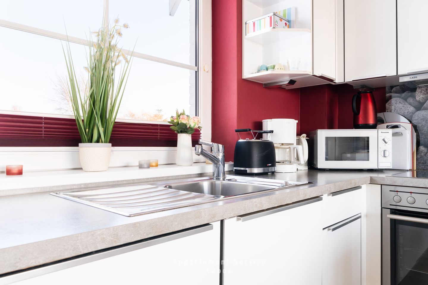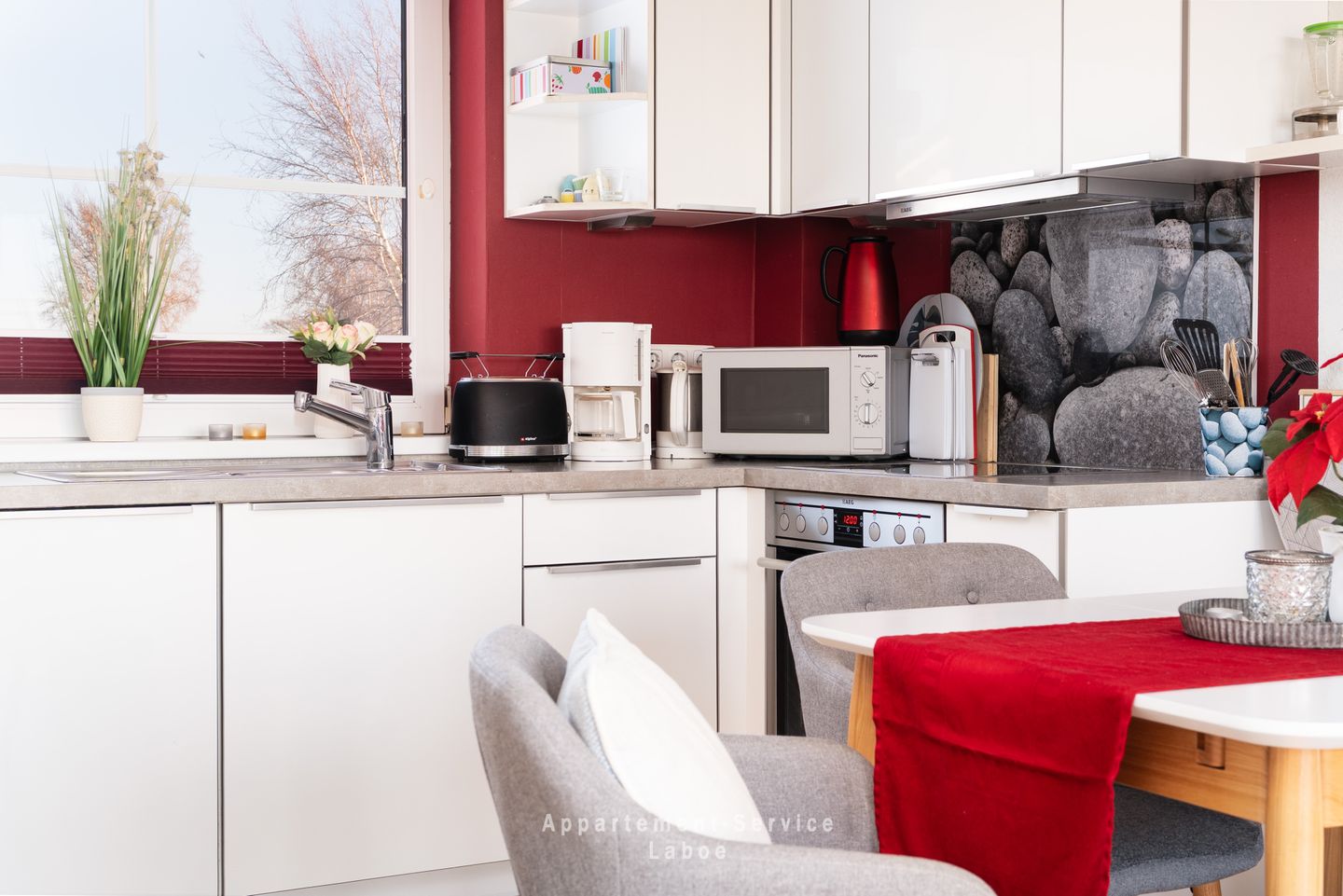 Die Küchenzeile wurde kürzlich modernisiert und hochwertig ausgestattet. Zur Verfügung stehen Ceranfeld, Backofen, Kühlschrank, Geschirrspüler, Mikrowelle sowie die grundlegenden Küchenutensilien. Der angrenzende Essplatz befindet sich im kombinierten Wohn und Essbereich. Dort gibt es außerdem eine gemütliche Sitzecke mit Fernseher, Stereoanlage und WLAN.