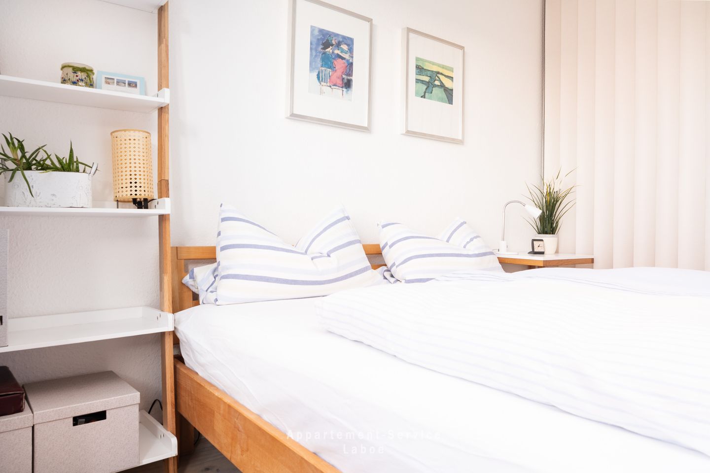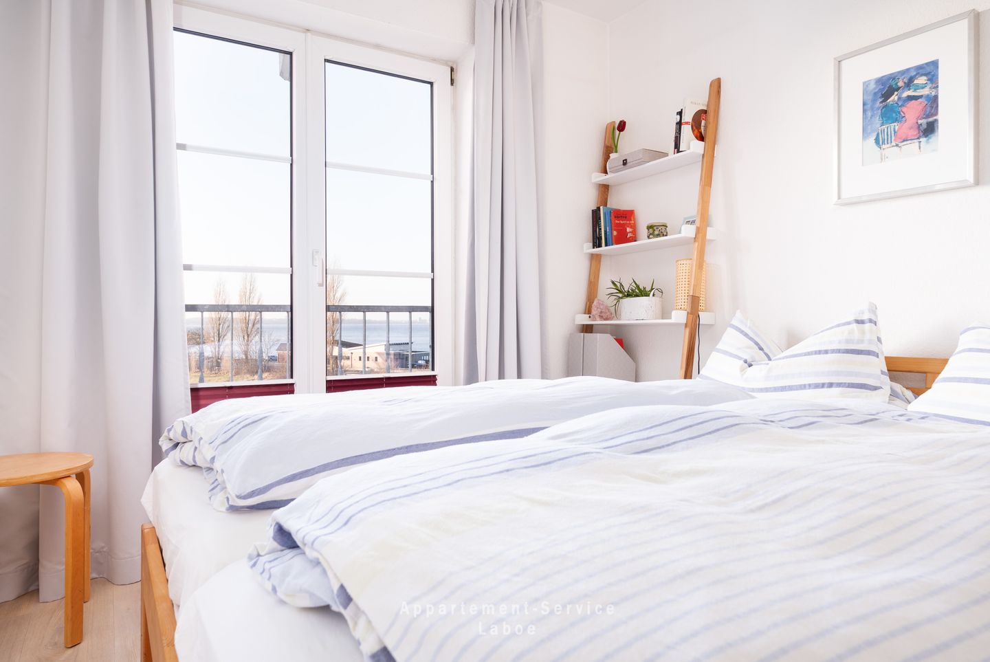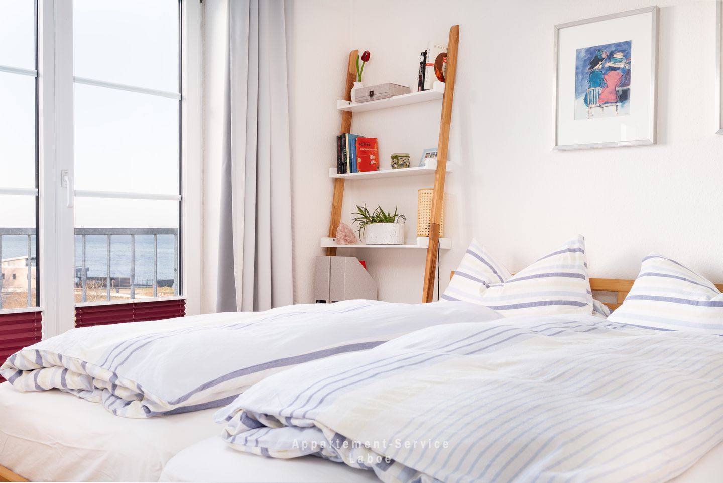 Das Schlafzimmer ist mit einem komfortablen Bett ausgestattet. Durch den französischen Balkon ist auch hier der Blick auf die Ostsee möglich. Das Badezimmer verfügt über Dusche und WC. Es ist kompakt, sauber und funktional gestaltet.