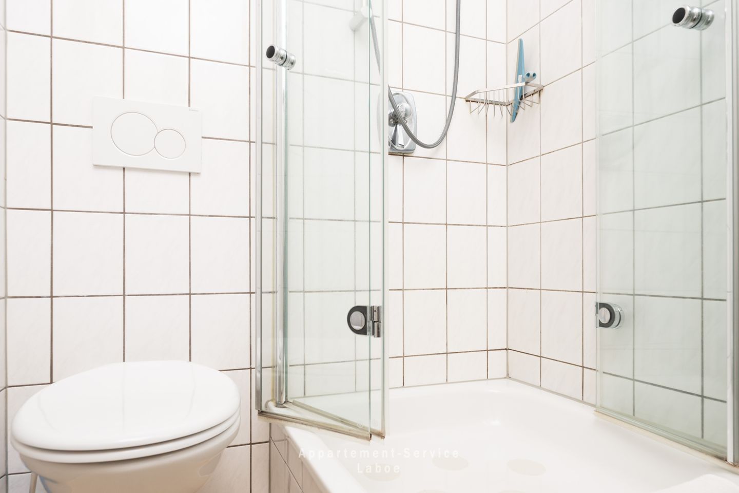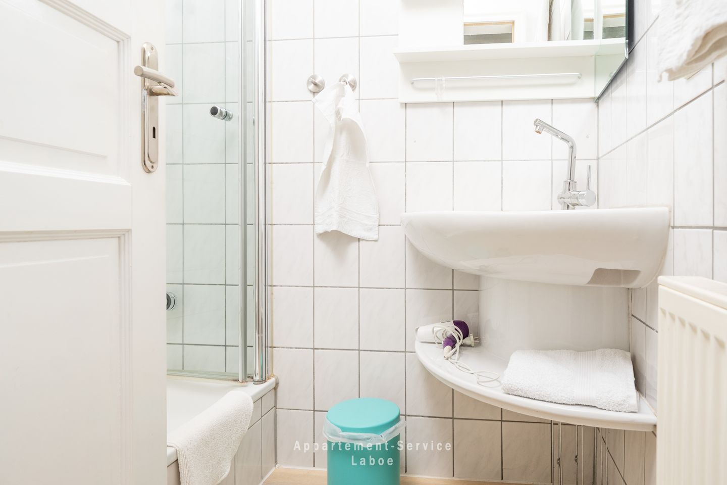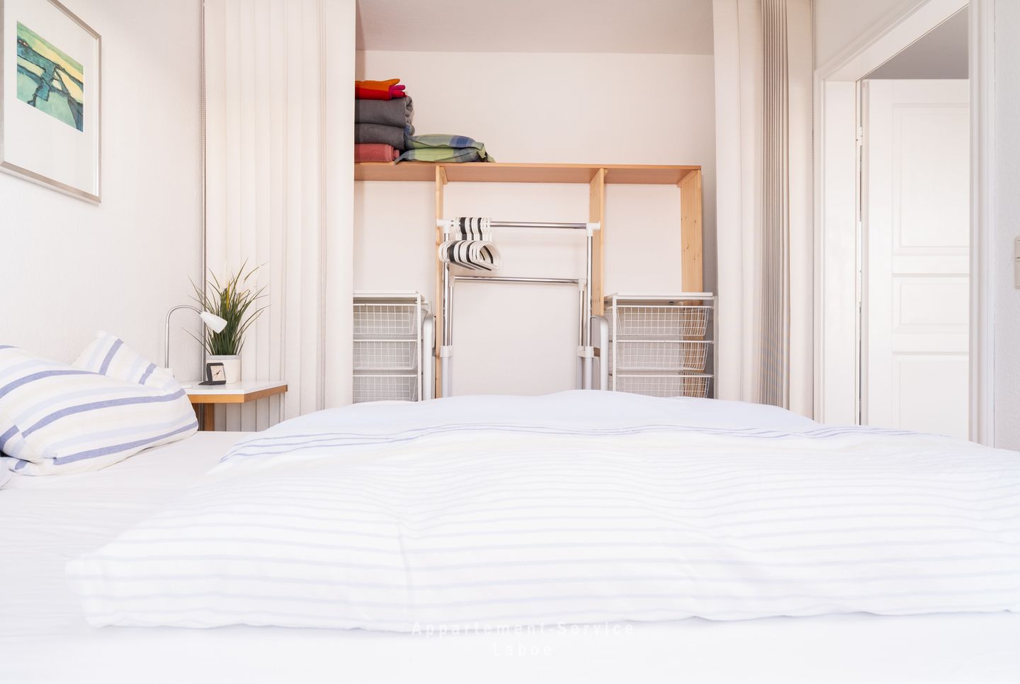 Das Schlafzimmer ist mit einem komfortablen Bett ausgestattet. Durch den französischen Balkon ist auch hier der Blick auf die Ostsee möglich. Das Badezimmer verfügt über Dusche und WC. Es ist kompakt, sauber und funktional gestaltet.